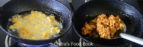 • Deep fry both the sides.Remove when the pakora turns golden brown.Drain in a tissue paper.If you want thick pakoras,add more water.I made it thin and crispy.So I used less water.