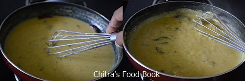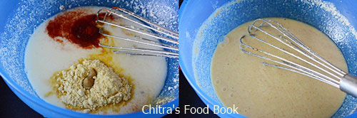 • Whisk the sour curd to a thick paste.To this add salt,turmeric powder,red chilli powder,besan flour ,G&G&G paste and 2 cups of water.Mix without lumps.