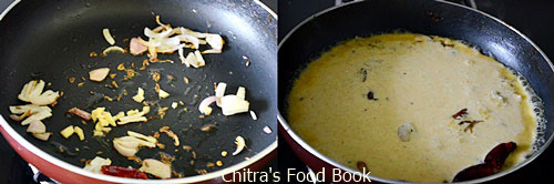• Heat oil in a kadai and splutter methi seeds,cloves,pepper corns,curry leaves,red chilli. Saute the onions,ginger bits and add the curd mixture.Let it boil for few minutes.Kadhi will thicken.So add some water if needed and boil the kadhi for more time.