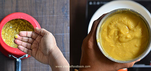 - Wash and pressure cook chana dal in required water till soft.