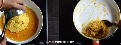 - Melt jaggery adding water. Strain the syrup. Add chana dal paste.