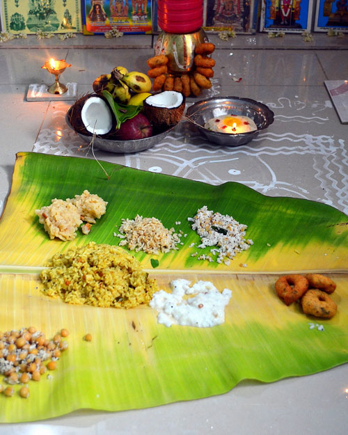 In another cooker, cook the raw rice for puliodharai, coconut rice, ellu sadam and curd rice. Remove 3/4th of the cooked rice and spread in a plate to cool down. Drizzle some sesame oil. Mash the remaining rice for curd rice. Add boiled milk, curd and salt to the mashed rice. Mix well and temper it. Temper and make the sundal. Grind the urad dal adding little water and make pepper vada batter if you din’t prepare the batter the previous night. Make 11 or 21 vada and tie in a thread to make vada malai. Do not use onions in this day for offering God.