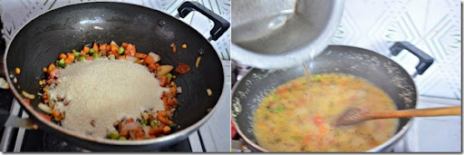 • You can also add the water after sauting vegetables, allow it to boil for sometime & then add the rava like we make for rava upma.