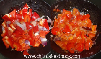 - Add capsicum and saute for few minutes till soft. Add tomato and salt.