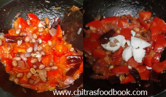 - Saute till tomato turns mushy. Add roasted peanuts, tamarind piece, grated coconut.
