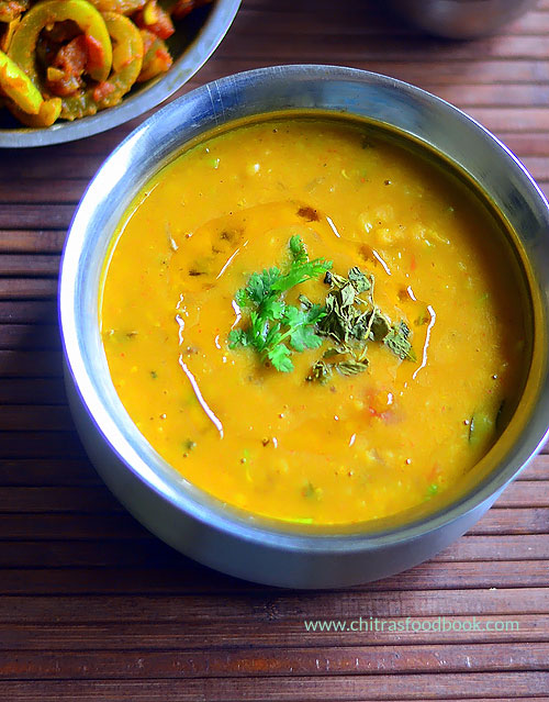 Restaurant style dal fry recipe with step by step pictures. Dal tadka and Dal fry are two different and popular side dish for rice and roti served in North India. In dal fry, cooked toor dal (Arhar dal in Hindi) is added to the sauteed onion, tomato and spices mixture whereas dal tadka is prepared by pressure cooking toor dal along with onion, tomato. Then it is tempered with spice powders separately. Dal fry can be prepared with moong dal as well. After I tried North Indian dal tadka successfully, I made this easy restaurant style dal fry recipe at home just to find the difference between two. Yes, there are some variations in the method of making, ingredients and taste. Recently when I went to mini Punjabi dhaba, I had this dal fry as a side dish for jeera rice. But I din’t like its taste. I felt it was bland. But this restaurant style dal fry recipe I tried after watching few YouTube videos came out very well with great taste ! I loved it very much. Even though I prepared it (without charcoal) without doing dhungar method, it was so good and flavorful. I served it with plain rice adding ghee. I also prepared Padawal sabzi / Snake gourd sabzi as side dish for this dal fry. It was a yummy combo which I liked it very much. I will post the sabzi recipe tomorrow. Here you go, dal fry in restaurant style with step by step pictures.