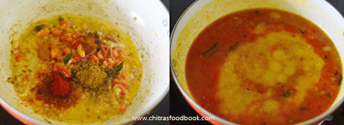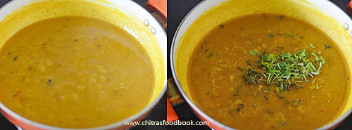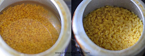 - Wash and pressure cook toor dal adding turmeric powder, water and drops of cooking oil.