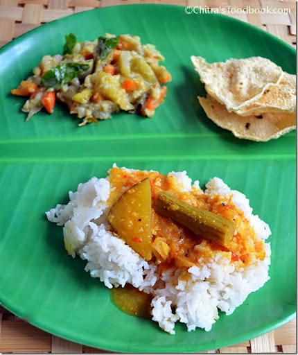 My mom makes Carrot puttu or avial as side dish for this sambar recipe. To me, just a papad/ appalam is enough.