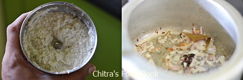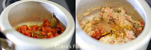 - Heat a pressure cooker base and add oil + ghee. Saute the bayleaf and black stone flower/Kalpasi. Add cumin seeds,onions , gg paste and saute till it turns transparent and raw smell goes off. Add mint leaves. Then add the tomato pieces and saute until mushy. Add the ground coconut paste, turmeric powder, red chilli powder and Garam masala powder. Add the required salt and saute well till the raw smell of masala vanishes. Do in medium flame.