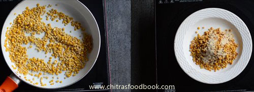 1. Heat 1 tsp of oil in a pan. Roast chana dal and urad dal in medium flame till golden.