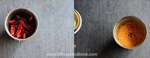 4. Add the roasted chillies to the dal. Cool down. Add salt and grind everything to a fine or slightly coarse powder as you like.