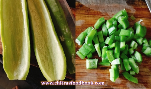 - Wash and peel the skin of Snake gourd. Chop finely and set aside.