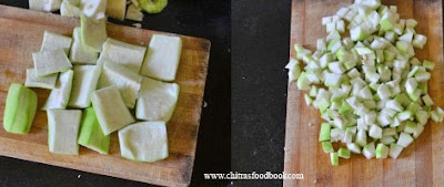 - Wash and peel the skin of bottle gourd. Chop finely.