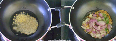 - Heat oil in a kadai. Splutter mustard seeds, urad dal, chana dal, curry leaves and hing. Add onion, green chilli and saute till transparent.