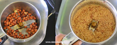 - Wash and peel the skin of bottle gourd. Cut vertically and remove the sponge / soft part. Chop into small pieces and set aside. Roast peanuts till its skin crackle. Grind to a coarse powder.