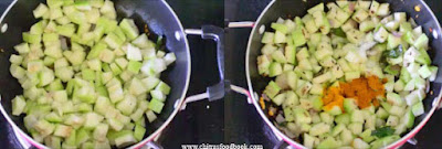 - Add the chopped bottle gourd pieces and saute for few minutes. Add turmeric powder, sambar powder and salt. You can add green chilli instead of sambar powder.