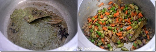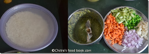 • Wash and soak the basmati rice for at least 30-45 minutes. Else you have to add 2 cups of water for 1 cup of rice. Chop all the vegetables and onions(finely)  & grind the masala. Keep it ready.