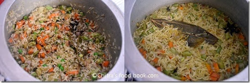 • Lastly add 1.5-1.75 cups of water (depending on the basmati rice brand) and a tsp of ghee and pressure cook in low flame till one whistle or 10-12 minutes.