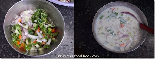• Finely chop all the vegetables. Mix well in a big bowl adding the required salt. Just before serving add the curd, Mix well without adding water. Tempering is not needed. Serve with pulao/biryani.