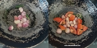 - Heat oil in a kadai. Saute cumin, onion, green chilli, garlic and tomato till mushy.