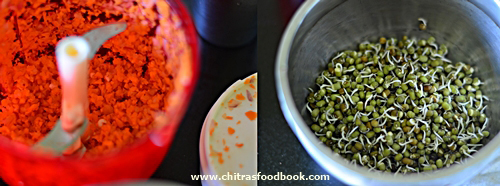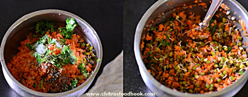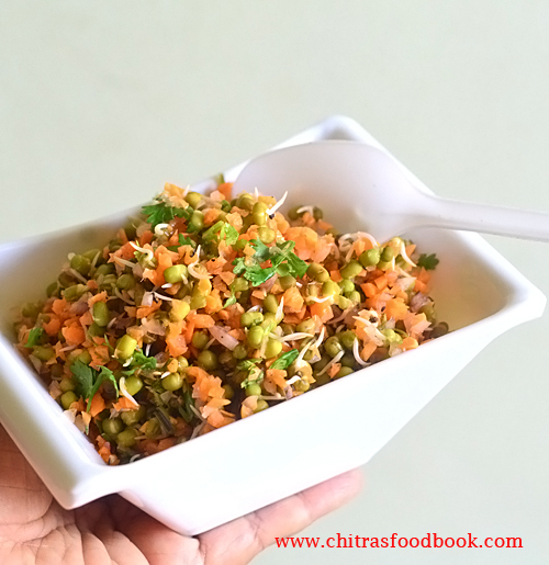 Children, elderly people, pregnant women and people with weak immune system should avoid eating raw or lightly cooked bean sprouts. Actually this moong bean sprouts salad recipe was suggested by my gynecologist for weight loss after delivery. So I followed the same for Sendhil as well. My doctor also suggested a raw green gram salad for milk secretion during lactation. Its a sweet salad recipe. I will post it soon. In Karnataka, people make this green gram salad adding pomegranate, coconut and do the seasoning which is very tasty. It is called as Kosambari in Kannada. For variations, I make it once in a week. I will try to post that recipe as well. Now lets see this basic sprouts salad with easily available vegetables and ingredients.