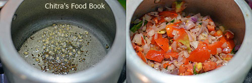 • Thakkali poricha kuzhambu : Heat oil in a pressure cooker base. Splutter mustard seeds, urad dal, chana dal, cumin seeds. Saute onions, curry leaves, green chillies and tomato till it turns mushy.