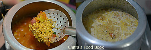 • Add water,moong dal,turmeric powder,salt and pressure cook for 2 whistles in low flame. In the mean time, grind the coconut+jeera to a smooth paste adding little water. After the steam is released from the cooker, add this paste and boil well. Gravy will thicken. So add water and salt accordingly. Serve with plain rice adding few drops of ghee.