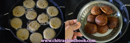 - Heat a paniyaram pan adding tsp of ghee in each hole. Pour the batter.