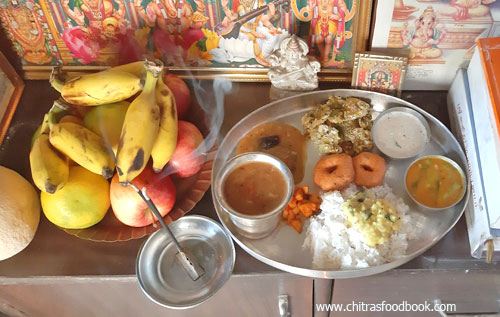 On this day we avoid vegetables like Drumstick, Bottle gourd, brinjal, Keerai/greens, cabbage, Beetroot, Carrot, Beans, Potato, Onion and garlic in our cooking as we offer the lunch menu to God.