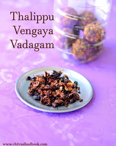 I am a big fan of Vengaya Vadagam/ Small onion vadagam since my childhood.This younger generation people may not be aware of this traditional recipe and slowly its forgotton by our people 🙁 When I was young, my dad used to buy a packet of thalippu vengaya vadagam from an Iyer mess every year during summer. My mom adds it in Thuvaram paruppu sadam, Kootan choru and we love to have it as a side dish for curd rice too. . After marriage, I was amazed to see my MIL making Kari vadagam/Vengaya vadam on her own. She says its a very simple recipe preparation and can be easily made at home. Our job is to just mix and make balls. Sun will do the remaining part, she says funnily. Since Sendhil is not fond of vadagam, she stopped making it for some years. This year, I requested her to make this yummy onion vadagam for me. Last week we prepared it in Bangalore. I felt the chopping part and sun drying part takes more time. But the end result will be worth the wait. It came out great with wonderful aroma while frying. Iam enjoying it by making vadagam chutney/thogayal and use it for tempering Vatha kuzhambu and Kootu varieties. Nowadays my lunch smells divine because of this vadagam. You too give a try and feel proud to make your own homemade vengaya vadagam recipe. Lets see how to make this easy and yummy Thalippu Vadagam/ Kari vadam at home.