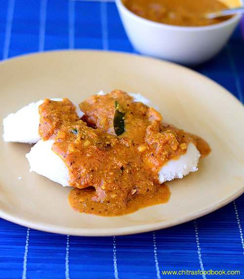 Boil the gravy till the raw smell of masala paste goes off. If the gravy becomes too thick, add little water, check for sat, boil and remove in a bowl. Garnish with coriander leaves. Serve hot with Idli, dosa adding a tsp of gingely oil.