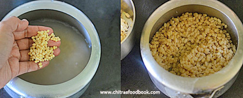 - Wash the urad dal and take in a pressure cooker. Add 1 cup of water and pressure cook in low flame for 2 whistles.