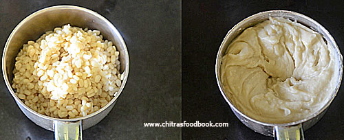 - Open the cooker after the steam is released. Drain the excess water if any and grind the urad dal to smooth paste like butter. You can add little water while grinding if needed.