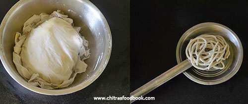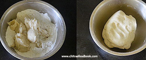 - Add urad dal paste and mix well till crumbly. Add little water to make a smooth, non sticky dough. Cover the dough with a wet cloth till use.