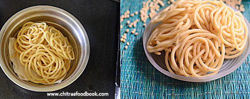 - Fill the dough in murukku press. Squeeze and make shapes in the back of ladle.