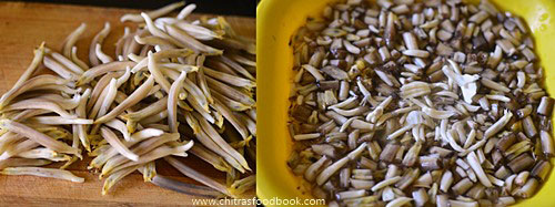 - Wash and clean the vazhaipoo florets. Chop into small pieces and immerse in buttermilk.