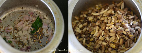 - In a pressure cooker base, heat coconut oil. Temper it. Saute onions.