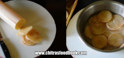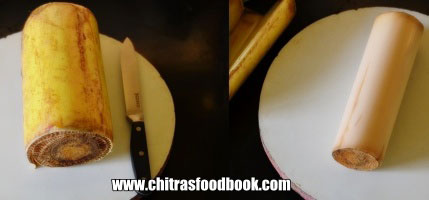 - Peel the outer stem part/ bark part and wash the inner ring. Chop into thin slices and keep immersed in buttermilk till use.