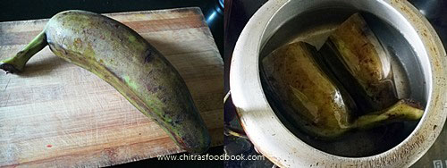 - Wash and pressure cook raw banana / Vazhakkai in high flame for one whistle.