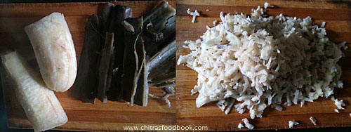 - Raw banana should be 3/4 th cooked. Remove the skin and grate it using a bigger grater.