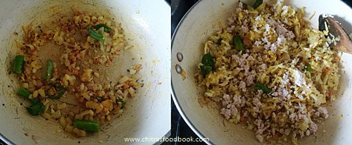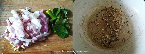 - Temper all the ingredients given above. Saute onion, green chilli, curry leaves and ginger.