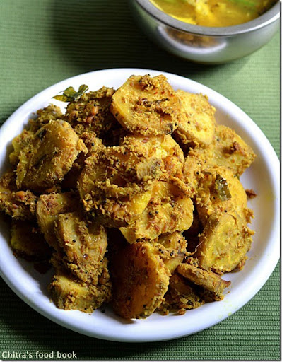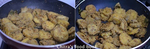 Heat oil in a kadai and temper all the ingredients given above.Put the masala coated raw banana pieces and saute in low flame for few minutes.Add little water (say 1/2 cup) and cover cook till banana pieces are done.Do not over cook the pieces.After it is cooked well,remove the lid and saute the mixture in high flame for few minutes till the mixture becomes dry and turns golden brown.