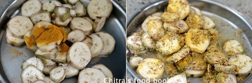 In a wide plate or bowl,take the raw banana pieces,turmeric powder,ground paste and salt.Mix well.