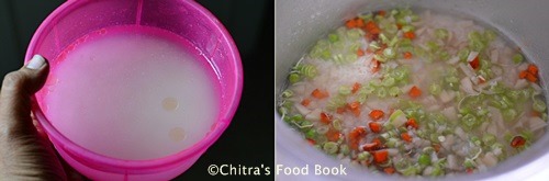 • Wash the rice twice & drain the water.Soak it adding 2.25 cups of water,lemon juice & oil for 1 hour.Rice will be soaked well.In the mean time,finely chop the vegetables,onion,capsicum & spring onion.Keep it ready.