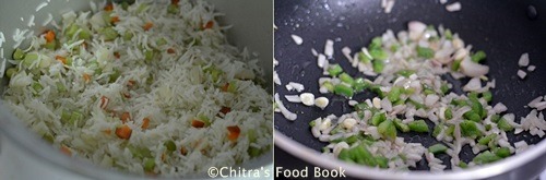 • Finely chop the cabbage,onions,garlic cloves,bottom part of spring onion & capsicum. Heat oil in a kadai & saute them well adding little salt( remember we have added salt in rice) Add this to the cooked rice.Add pepper powder & keep it closed till use.Now the rice cooker will be in”Keep warm” mode.