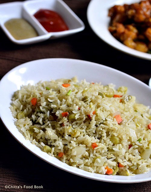I am glad i have successfully reached the 3rd post in my Sunday lunch Recipes SeriesHappy.I have been sharing biryani,pulao & other rice varieties that i make in weekends.This week,i have blogged my vegetable fried rice recipe in Indian style using electric rice cooker.I know most of u make veg biryani & veg pulao in rice cooker.But making a fried rice in rice cooker may be new to some of u.Not just this,the method i have shared here may also be new & it is somehow different from our usual fried rice recipe.A very big thanks to my dear friend Shalini for teaching me this easy,hassle free,wonderful ,Indian style fried rice recipe.Whenever i go out for shopping in weekends with my family,i make this rice recipe along with curd rice.It stays warm & as soon as we reach home,i just saute the required amount in ghee & serve it hot hot.As we love to have fried rice with tomato sauce as side dish,i don’t make any specifically.But my friend suggested peas butter masala & paneer butter masala as the best side dish for fried rice.So make it as per your choice.Ok,Lets see how to make fried rice recipe in electric rice cooker.