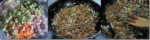 Vegetable fried rice is our favourite Chinese rice recipe. When my husband was in US for a short period , he used to have this rice for lunch in which the quantity of vegetables was more than rice. After he came from the trip, he told me to make fried rice adding more vegetables than rice. I started making the same way and it made the rice more healthy. I used to add ajinomotto but after knowing its ill effects I stopped using it. But It din’t make any difference in taste and flavour. The only part I feel lazy/difficult is to chop the vegetables finely. Otherwise its an easy to make dish. It will come out very flavourful too. Make sure you add all these vegetables to get the exact taste of fried rice.