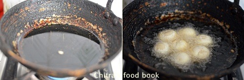 - Put a pinch of batter in oil and as soon as it rises, simmer the flame completely and drop 3-4 balls in oil based on its size. Let it cook in slow flame. Toss it once or twice in the middle. Cracks will form automatically. Hence its called “Vedi cake/Vettu cake”.